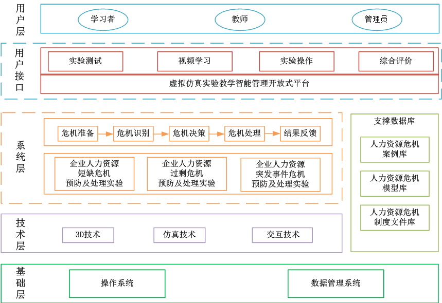 本系统架构分用户层、用户接口、系统层、技术层、基础层和数据库。用户层的学习者、教师、管理人员可以通过虚拟仿真实验教学智能管理开放式平台进行视频学习、实验测试、实验操作、综合评价等;系统层主要包括人力资源短缺危机预防与处理实验、人力资源过剩危机预防与处理实验和人力资源突发事件危机预防与处理实验。每个实验均包括“危机准备——危机识别——危机决策——危机处理——结果反馈”五大环节;技术层主要采用了3D技术、仿真技术、交互技术等现代技术;基础层主要包括操作系统和数据库管理系统; 数据库主要包括人力资源危机案例数据库、人力资源危机制度文件数据库、人力资源危机模型库。系统构架图如图47所示。